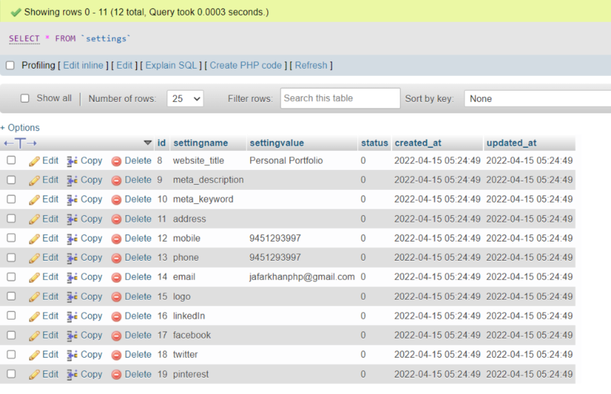 After run above command successfully, you will be found new created file on this path “database/seeds/SettingsTableDataSeeder.php”. In this file i make four sample settings for settings table using insert query. So open SettingsTableDataSeeder.php file and some sample data like as bellow.